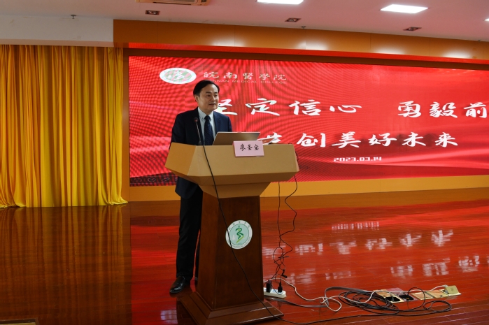 廖圣宝以“坚定信心,勇毅前行,共创美好未来”为题,结合学校实际,突出时代特征,融入时政热点,从“怎么样看待三年抗疫的巨大成就?”“怎么样看待疫情防控政策的‘变’与‘不变’?”“怎么样看待未来经济社会发展?”“怎么样投身于今后的学习和生活?”等四个方面层层深入、循序渐进、深入浅出地进行系统阐述和深入解读。他指出,2023年是学习宣传贯彻党的二十大精神的开局之年,勉励同学们要深入学习贯彻党的二十大精神,坚持不懈用习近平新时代中国特色社会主义思想武装头脑,把对祖国血浓于水的情感贯穿学业全过程、融汇在事业追求中。廖圣宝强调,奋斗是青春最亮丽的底色,行动是青春最有效的磨砺。希望同学们保持客观理性认知,增强辩证思维能力;珍惜校园学习时光,提升自身奋斗本领。坚定理想信念,争做初心使命的守护者;加强道德修养,争做仁心仁术的实践者;擦亮青春底色,争做民族复兴的推动者,不负殷切期盼,堪当时代重任,切实承担起新时代赋予青年人的责任与使命。