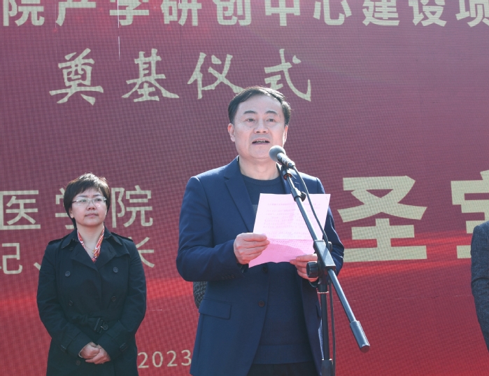 党委副书记、院长廖圣宝致辞。他指出,产学研创中心是我校加强学科建设,打造高水平创新平台的又一重要举措,将为学校可持续发展提供强大的平台支撑,对学校的事业发展具有重要意义。就工程建设,他希望项目建设各方加强组织协调,确保工程进度;规范有序施工,确保工程质量;落实安全责任,确保施工安全;加强工程监理,确保施工规范;改进工作作风,确保服务质量,把产学研创中心建设成为高标准、高质量、可推广的样板工程。
