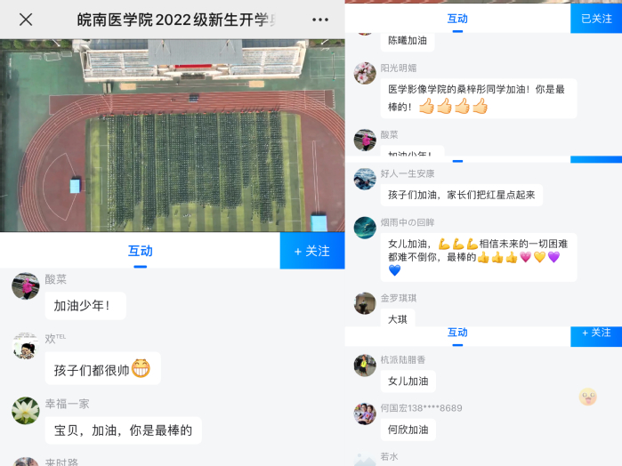 在此次开学典礼暨军训动员大会中,学校采用“现场+线上直播”的方式对典礼现场进行直播,场外人员可通过网络链接同步进行观看。至活动结束时,直播在线观看八千余人次,收到来自新生家长、校友等祝福千余条,获得了一致好评。