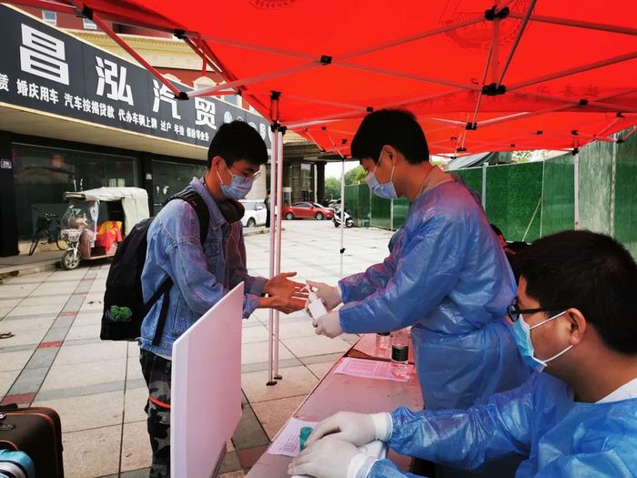 5月6日凌晨6:30,学校教职工志愿者开始装备物资,前往火车站和汽车站接站点按照接站、消毒、测温、登记、扫码等流程进行迅速布场。学生到站后,志愿者指引学生在接站点集合,并引导至测温棚进行手部消毒和体温检测。同时,负责医疗保障的志愿者观察学生有无咳嗽等相关症状。最后依次进行核验身份、登记名册和扫安康码等,跟车志愿者组织无异常情况学生依次上车,学生乘车后隔位落座、佩戴口罩、严禁交流。到站后车辆内部进行严格消毒,三天共接站70余车次。学生到校后,辅导员或学生管理人员校园入口处进行“一对一”认领,在校门口处经过身份确认、行李消毒和实名登记等流程后,学生间隔1.5米排队通过专设的测温通道。经红外线测温仪测量后,体温正常的学子带上行李正式进入校园,家长及外来无关人员、车辆一律不准入校,真正把好学生返校第一道关口。在赭麓校区和滨江校区教学楼和宿舍楼值班点,各学院工作人员第一时间向返校的学生发放体温计、口罩等防疫物资,确保学生返校后具备基本防护条件。