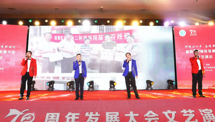 七十载春华秋实,七十年励精图治。飞扬的歌声,吟唱着难忘的岁月;优美的舞步,激荡着时代的鼓点。整场文艺汇演节目形式多样,内容精彩纷呈,高潮迭起,展现了医院的文化建设内涵和全院职工积极向上的精神风貌。展望未来,二附院将赢来全新的发展时期。新时期,赋予医院新的责任,二附院人将以坚如磐石的信心,只争朝夕的劲头,坚韧不拔的毅力,携手共创医院更加美好的明天!