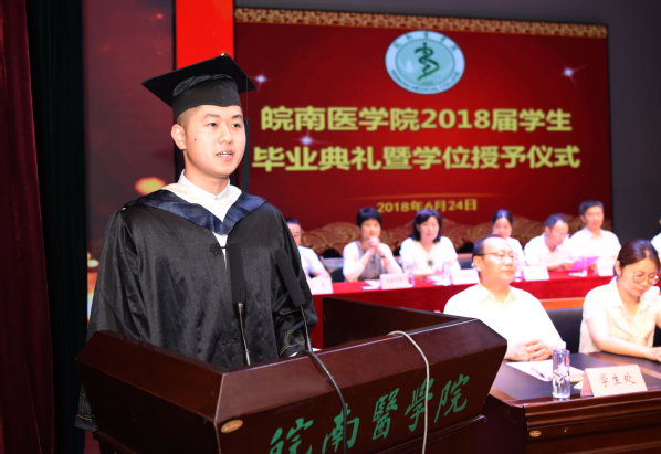 教师代表、药学院化学教研室吴运军教授对同学们表达了殷切期望,希望同学们牢记皖医精神,甘于寂寞,学会独立思考;坚守理想,敢于追求人生幸福;为人谦和,学会理解、感恩和坚强。重症护理学专业孙盼盼同学、临床医学专业庄晓鹏同学分别代表研究生和本专科毕业生发言,表达了对母校的诚挚谢意和惜别之情,表示将谨记母校校训,继承和发扬皖医精神,脚踏实地,敢于担当,奉献社会,在逐梦路上奋发向上、永不言弃,展现皖医人的风采。
