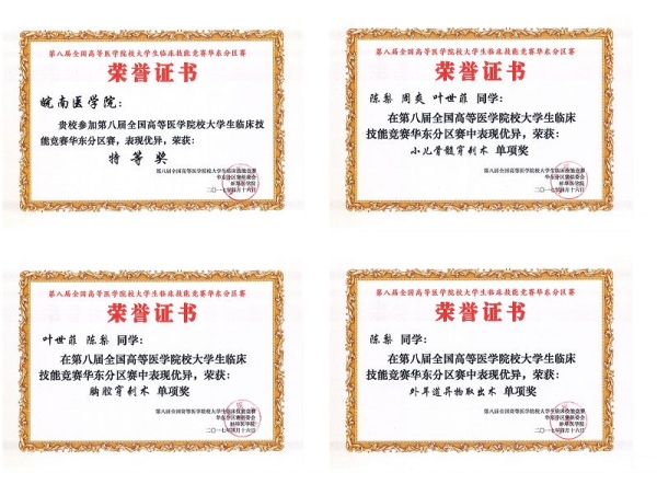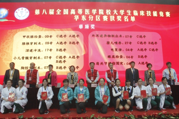 我校一直以来高度重视实践教学,近年来学校认真总结实践教学取得的宝贵经验形成物化成果,不断推进教育教学改革,继续深化内涵建设,大力实施“质量立校”、“特色兴校”战略,努力提升学生综合素质、创新能力和实践能力。至今全国高等医学院校大学生临床技能竞赛(华东分区赛)共举办7次,我校分别荣获特等奖2次、一等奖1次、二等奖3次和三等奖1次。这些成绩的取得离不开校领导和第一附属医院领导的高度重视和精心指导,离不开各相关部门的相互密切配合和通力协作,离不开广大教师的潜心教学和科学育人,更离不开广大培训指导教师的精心指导和辛勤付出以及我校广大学子的勤学苦练、团结协作和奋力拼搏;充分展现了我校办学综合实力和核心竞争力,极力提升了学校美誉度和社会满意度。