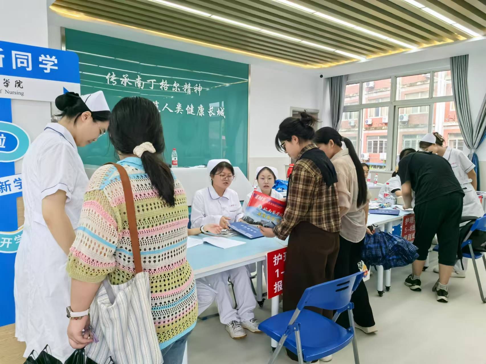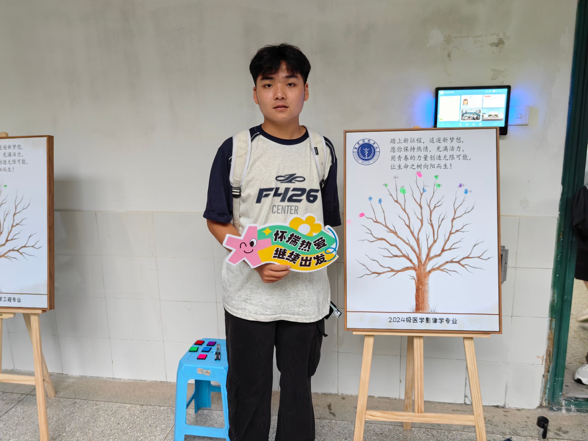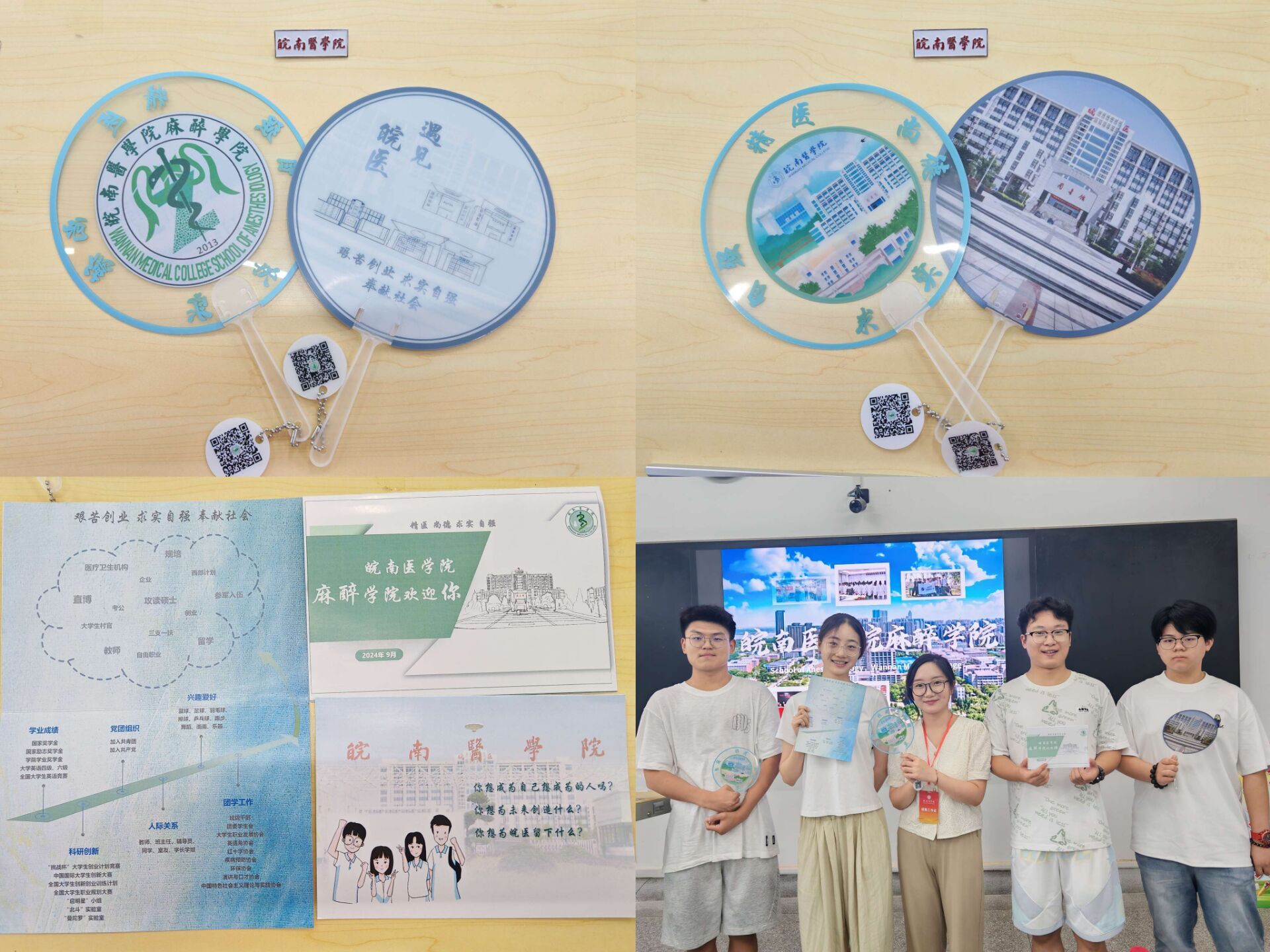 各二级学院根据自身学科特色、学院文化等特点,纷纷设计了别出心裁、充满趣味性的迎新活动:药学院将专业思政与迎新相结合,现场展示学生野外采集的中草药标本,并为每位新生准备精美的驱蚊中药香囊;医学影像学院制作“生命之树”签到板,每位新生在上面留下自己的签名和指纹,共同构成了茂盛的枝干和树叶,寓意着每个人都是集体的一员,同时也都是独一无二的;基础医学院举办基础医学优秀人文作品展,来进一步激发学生的学习兴趣;检验学院在新生报到处设置“时光邮局”,组织新生写下对大学生活的憧憬和目标并投入邮局,待到毕业时再开启看看自己是否达成了最初的梦想;麻醉学院为每一位新生赠送了带有“皖医”属性的扇子和入学卡片,融入了皖医精神、校训、学业生涯规划、职业去向、大学生活内容等信息,让新生进校之初就接受一次“润物无声”的入学教育。