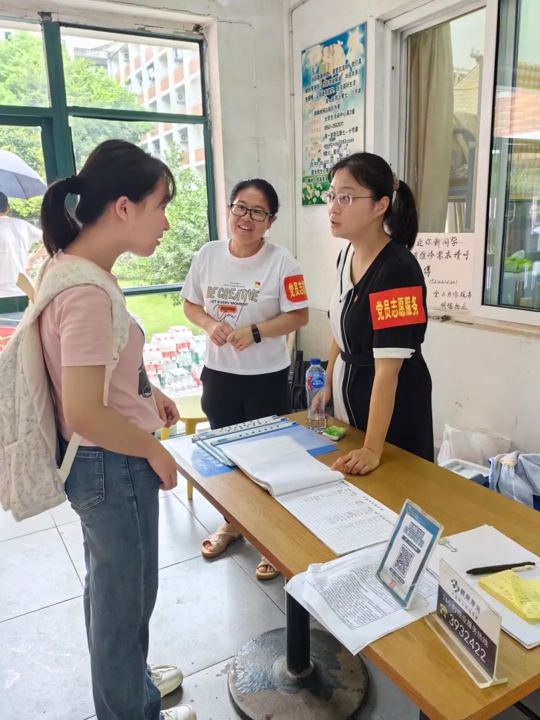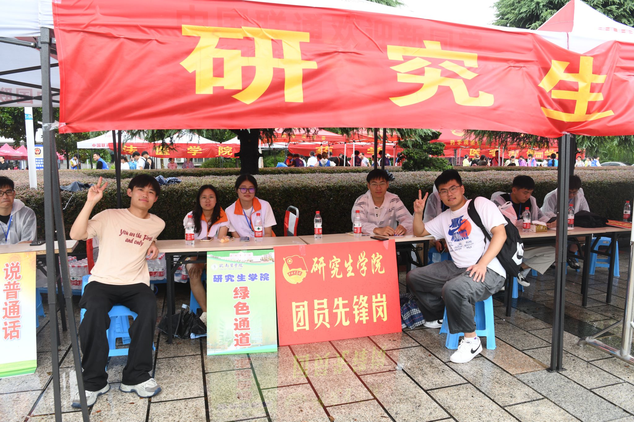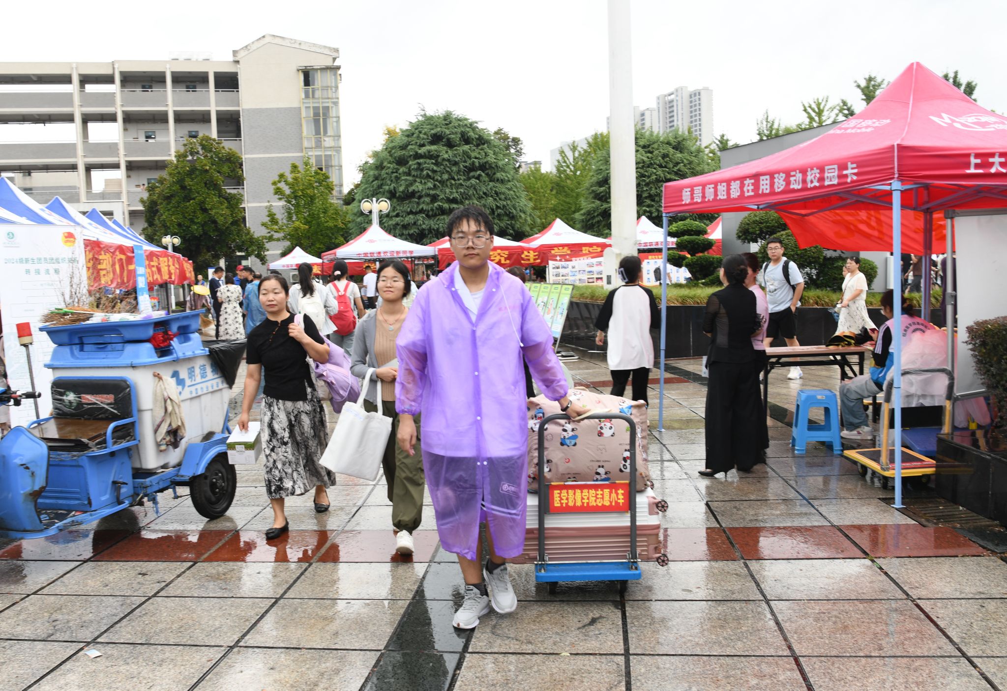 全心全意迎新生,全力以赴办实事。在迎新现场,还有一支由师生党员组成的志愿服务队。他们统一佩戴党徽,亮出党员身份,用心用情用力投身迎新工作中,开展交通疏导、防诈防推销宣传、新生引导咨询、行李搬运等工作任务。尤其迎新首日,由于校门口市政道路维修、校内停车空间有限,为避免自驾车辆拥堵,保证交通通畅,由教师党员组成的党员先锋队早早到达指定位置,配合保卫处耐心引导新生报到自驾车辆有序进校、安全停放、下卸行李、定向驶离。虽然穿着雨衣,但雨水和汗水却早已浸湿了他们的衣背。据统计,迎新期间,全校共设立党员服务站16个,成立党员服务队16个,有近600名师生党员参与迎新工作中,他们以实际行动擦亮了党员底色,让党旗在迎新一线高高飘扬,让党徽在迎新一线闪闪发光。