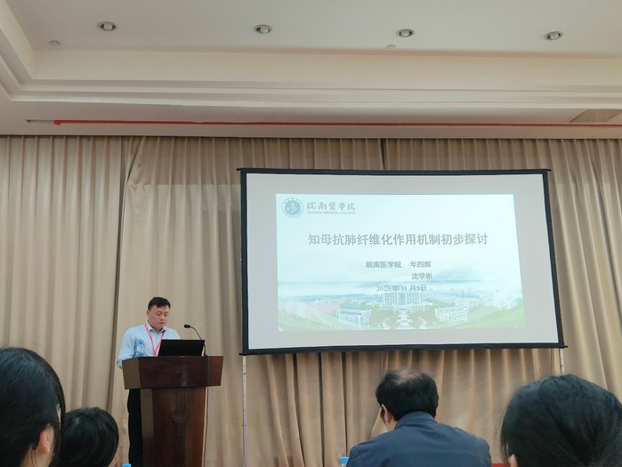会议以“促进我国中医药科研领域广泛交流,全面提升中医药科研能力,加快推动中医药科技成果转化,以科技创新与成果转化助力中医药事业振兴发展”为主题,设立专家论坛与5个分论坛,邀请了中国工程院院士俞梦孙、国医大师李佃贵等作精彩的学术报告。会上,我校药学院教师沈学彬以“知母抗肺纤维化作用机制初步探讨”为题作专题学术报告,就知母总提取物以及主要活性成分对肺纤维化的保护作用进行汇报,介绍了团队目前在知母抗肺纤维化作用中取得的进展,获得了与会专家的关注和广泛讨论。